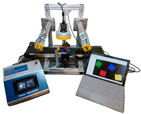 Un démonstrateur constitué d’une caméra, d’un convoyeur et d’un éclairage spécifique a été développé lors d’un précédent projet (voir photos précédente et suivante). En se basant sur ce système (ainsi qu’un banc plus simple utilisé au semestre 6) et en réalisant des caractérisations d’objets (colorimétrie…), vous devrez proposer des applications proches de celles de l’industrie pour la détection de formes et de couleurs, en essayant de mettre en avant les limites des différentes approches : tant sur le point du matériel utilisé (caractéristiques de la caméra, choix de l’objectif et de l’éclairage) que sur les algorithmes choisis.